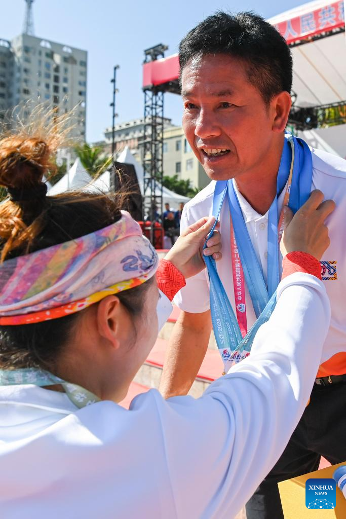 Lu Chuntao (L) of Team Guangxi puts the medal on Lan Jianzhuo, her coach and dean of the Institute of Physical Education of Hechi University, after the single bamboo drifing event at the 12th National Traditional Games of Ethnic Minorities of China in Sanya, south China's Hainan Province, Nov. 28, 2024. (Xinhua/Cao Yiming)