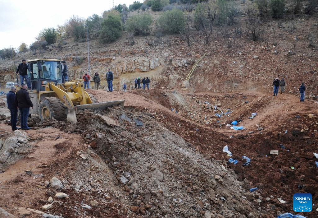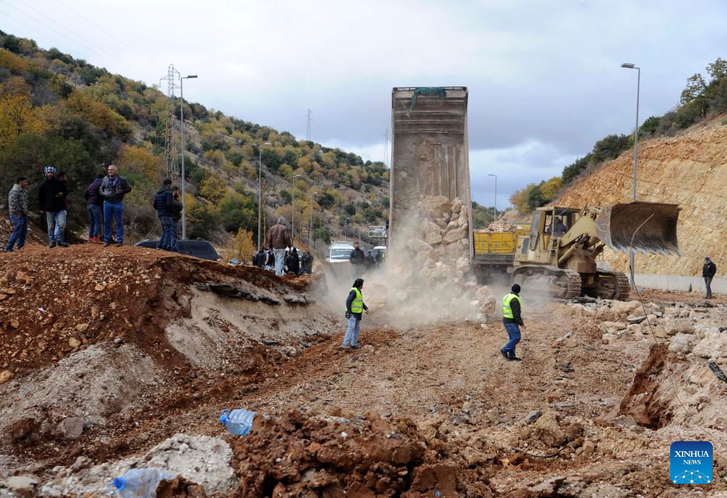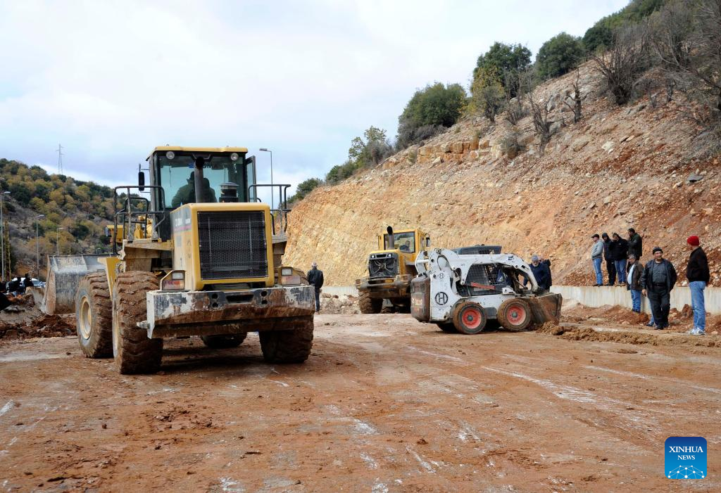 Staff members repair road damage near the Jdeidet Yabous border crossing between Syria and Lebanon on Nov. 27, 2024. (Photo by Ammar Safarjalani/Xinhua)