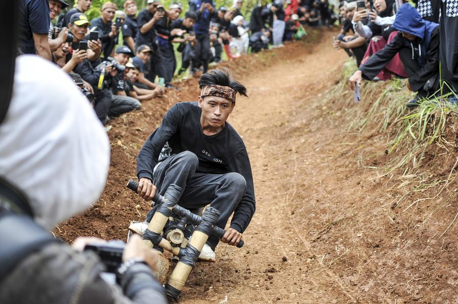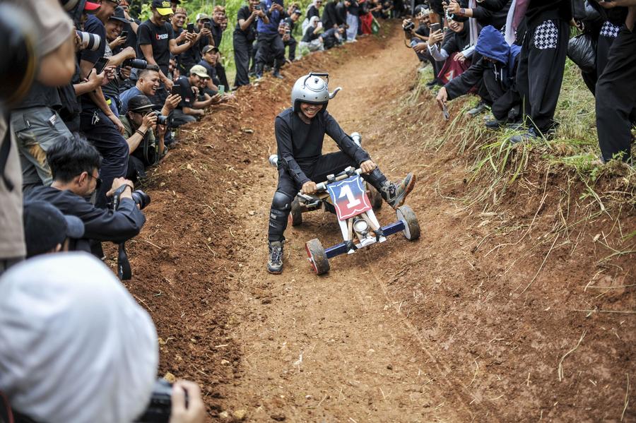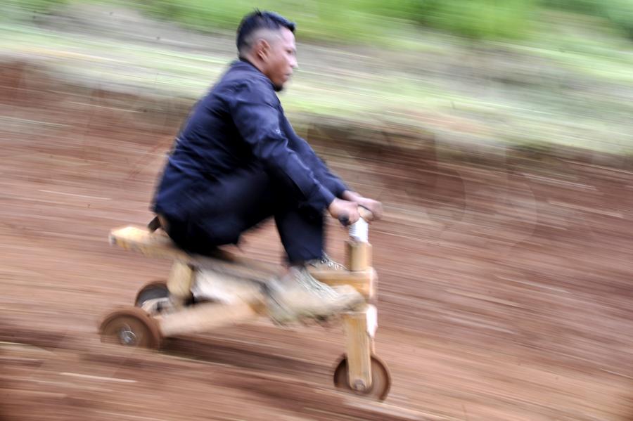 A participant rides a traditional wooden cart, locally known as kadaplak, downhill at Cisurupan in Bandung, West Java Province, Indonesia, Nov. 28, 2024. (Photo by Septianjar Muharam/Xinhua)