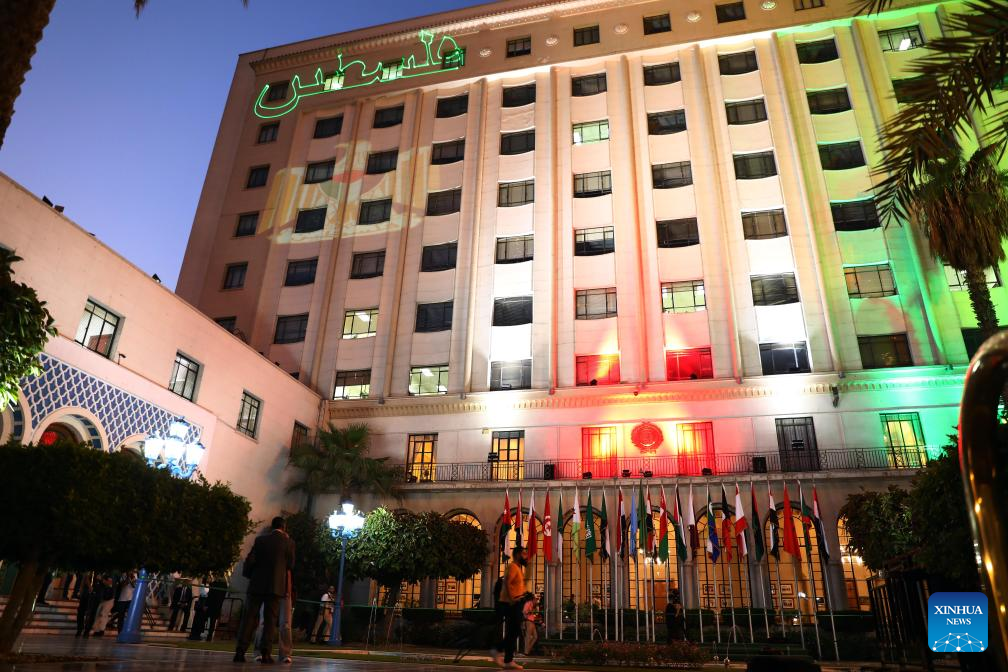 The Arab League (AL) headquarters is lit with the colours of the Palestinian flag in Cairo, Egypt, on Oct. 11, 2023.