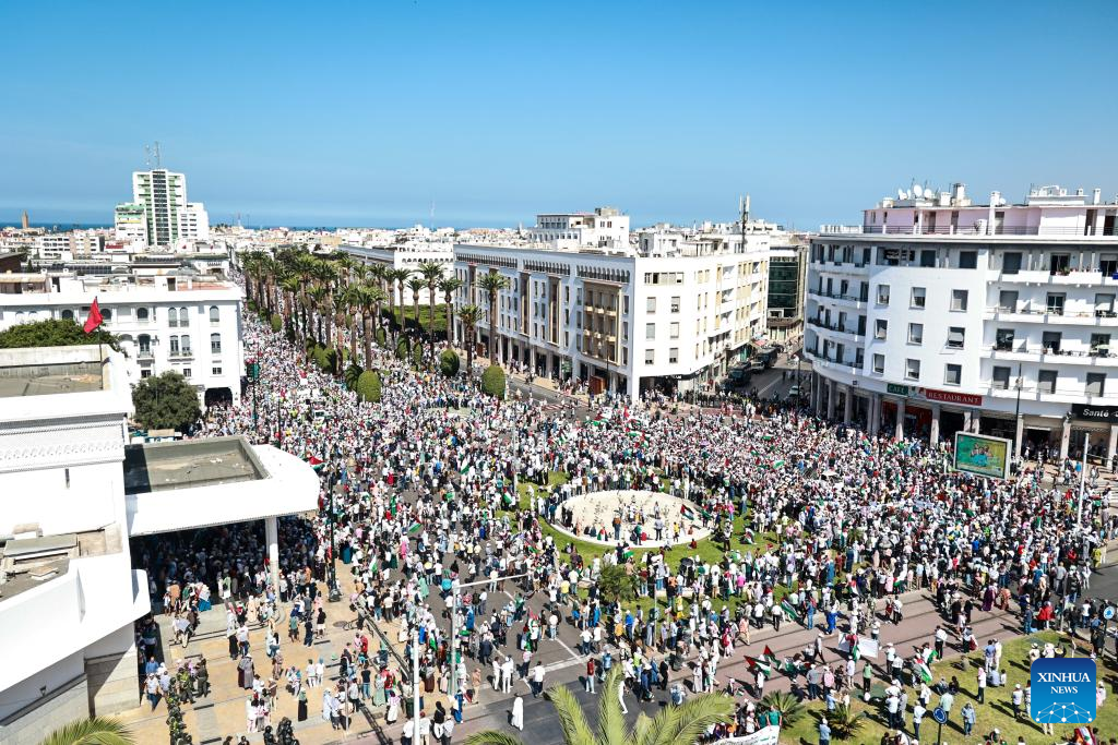 People take part in a rally to voice support for Palestinian people in Rabat, Morocco, on Oct. 6, 2024.