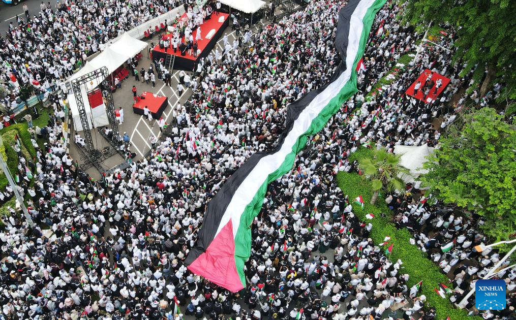 An aerial drone photo taken on Jan. 13, 2024 shows people attending a rally to support people in Palestine, in Jakarta, Indonesia.