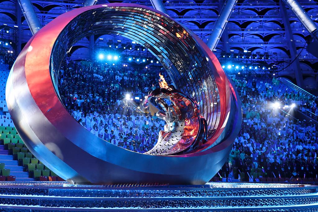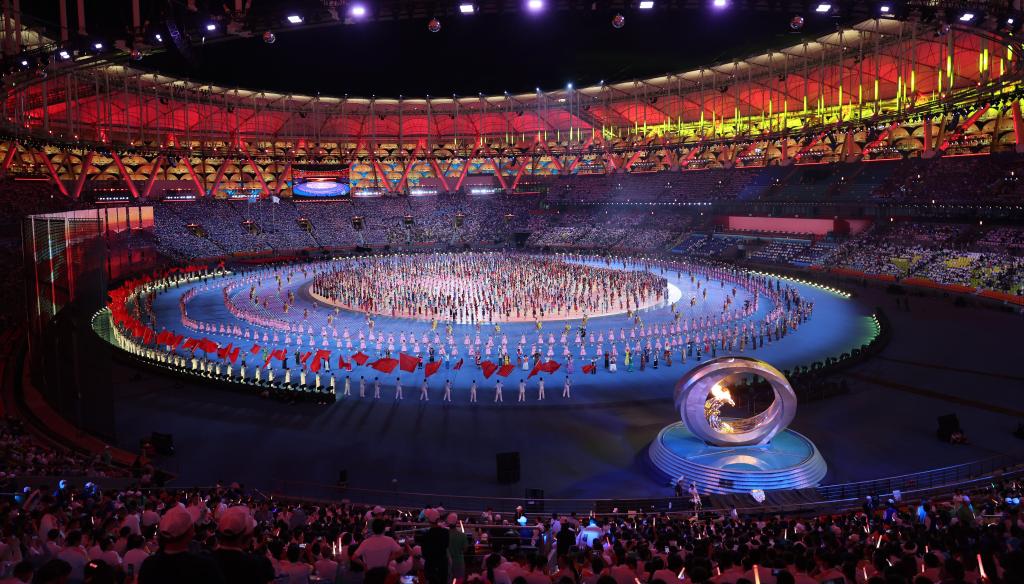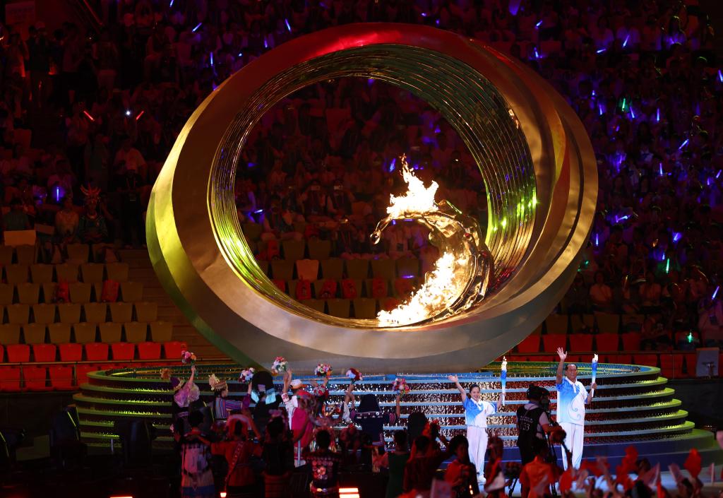 The cauldron is extinguished during the closing ceremony of the 12th National Traditional Games of Ethnic Minorities of the People's Republic of China in Sanya, south China's Hainan Province, Nov. 30, 2024. (Xinhua/Jiang Han)