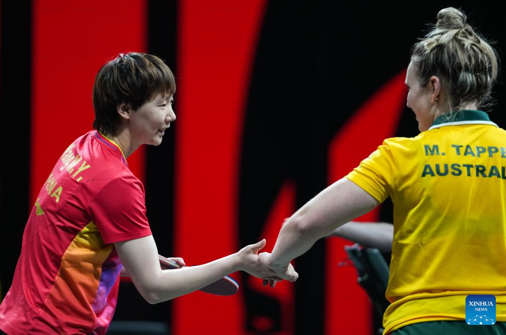 Wang Manyu (L) of China greets Melissa Tapper of Australia after their women's singles match of the stage 1 group 1 match between China and Australia at the ITTF Mixed Team World Cup 2024 in Chengdu, southwest China's Sichuan Province, Dec. 1, 2024. (Xinhua/Jiang Hongjing)
