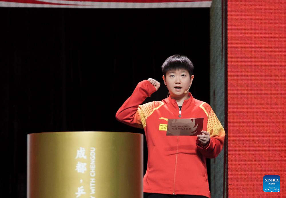 Sun Yingsha takes oath as the representative of athletes at the opening ceremony for the ITTF Mixed Team World Cup 2024 in Chengdu, southwest China's Sichuan Province, Dec. 1, 2024. (Xinhua/Jiang Hongjing)