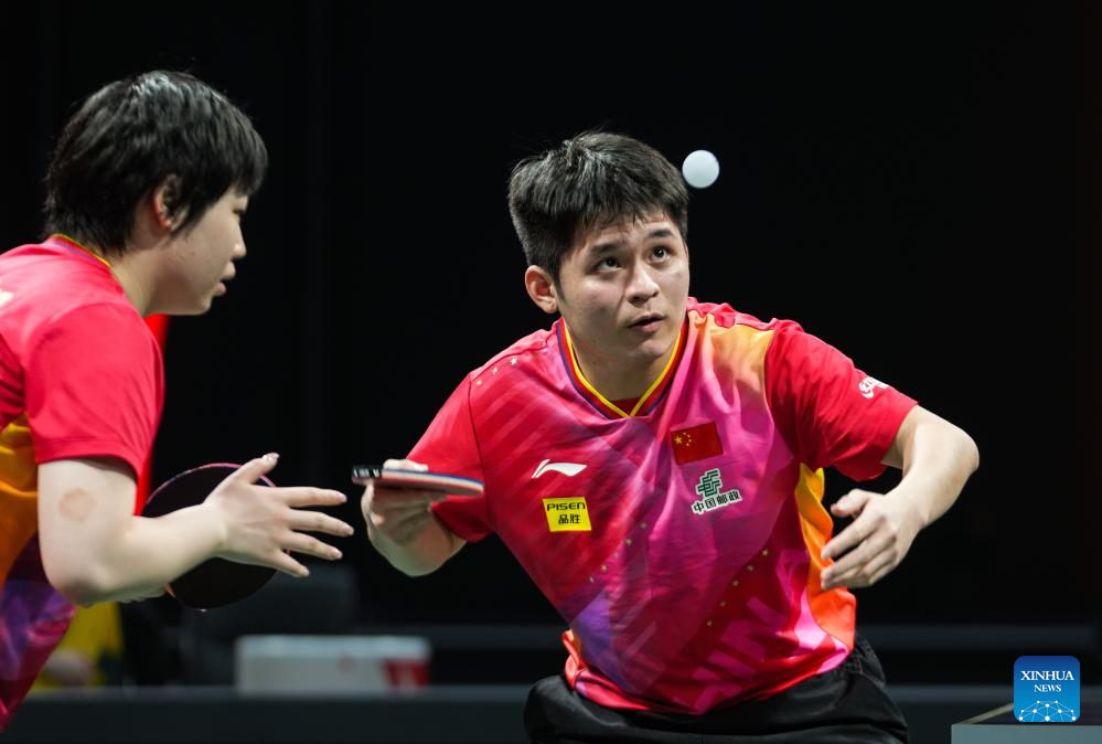 Lin Shidong (R)/Kuai Man of China compete against Finn Luu/Jian Fang Lay of Australia during the mixed doubles match of the stage 1 group 1 match between China and Australia at the ITTF Mixed Team World Cup 2024 in Chengdu, southwest China's Sichuan Province, Dec. 1, 2024. (Xinhua/Jiang Hongjing)