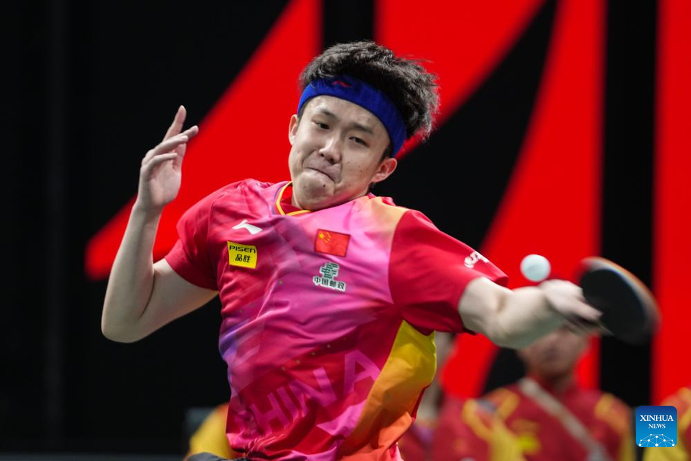 Wang Chuqin of China hits a return to Bae Hwan of Australia during the men's singles match of the stage 1 group 1 match between China and Australia at the ITTF Mixed Team World Cup 2024 in Chengdu, southwest China's Sichuan Province, Dec. 1, 2024. (Xinhua/Jiang Hongjing)