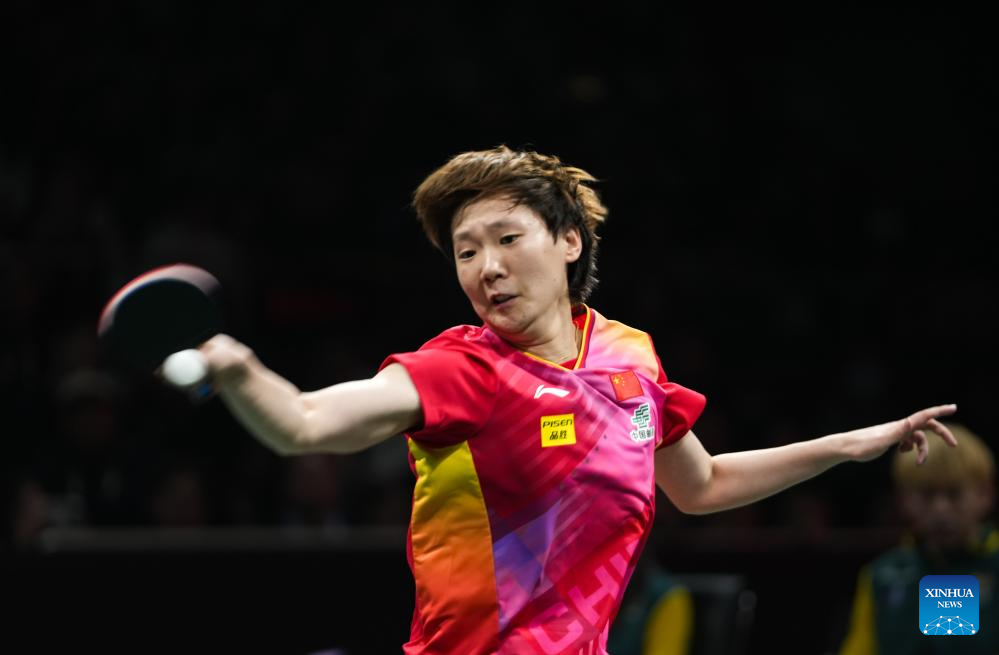 Wang Manyu of China hits a return to Melissa Tapper of Australia during the women's singles match of the stage 1 group 1 match between China and Australia at the ITTF Mixed Team World Cup 2024 in Chengdu, southwest China's Sichuan Province, Dec. 1, 2024. (Xinhua/Jiang Hongjing)