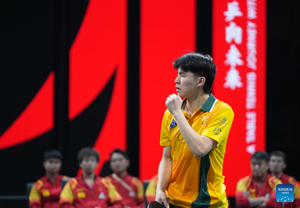Bae Hwan of Australia celebrates scoring while competing against Wang Chuqin of China during the men's singles match of the stage 1 group 1 match between China and Australia at the ITTF Mixed Team World Cup 2024 in Chengdu, southwest China's Sichuan Province, Dec. 1, 2024. (Xinhua/Jiang Hongjing)