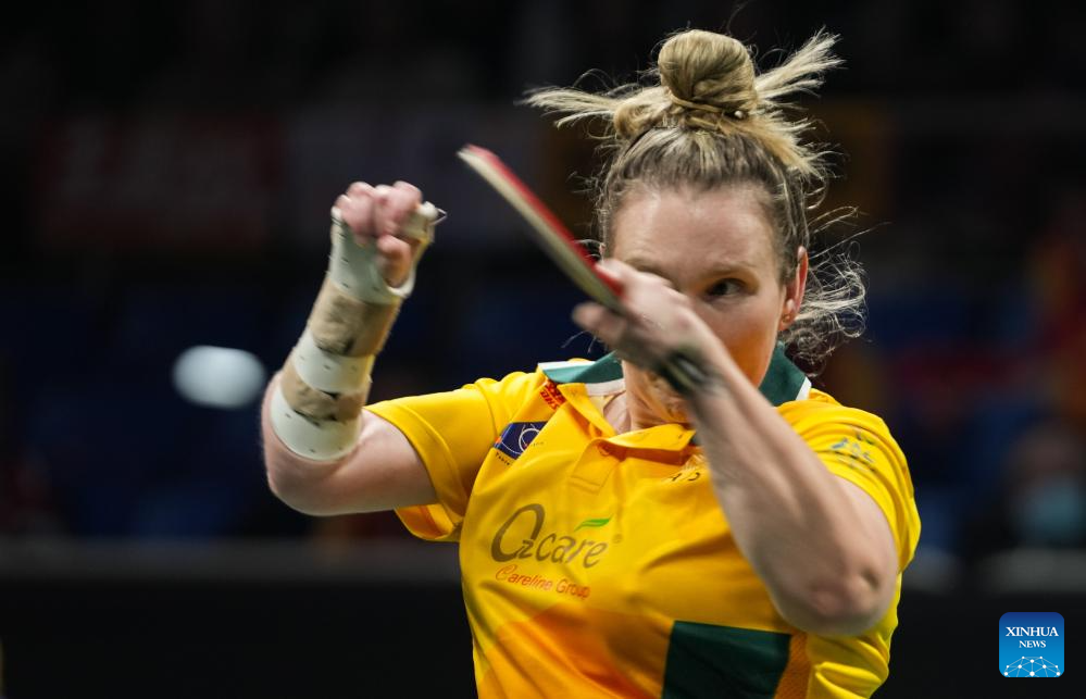 Melissa Tapper of Australia hits a return to Wang Manyu of China during the women's singles match of the stage 1 group 1 match between China and Australia at the ITTF Mixed Team World Cup 2024 in Chengdu, southwest China's Sichuan Province, Dec. 1, 2024. (Xinhua/Jiang Hongjing)