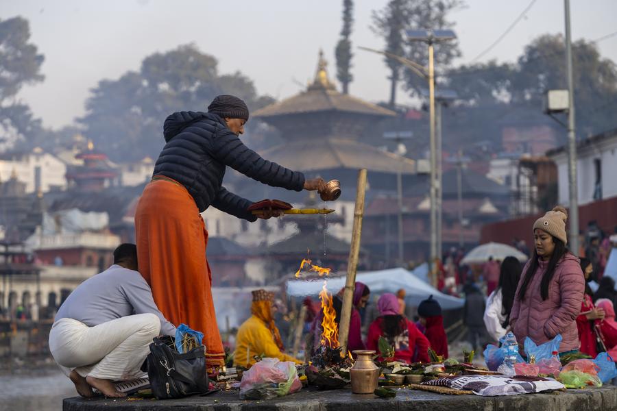 A priest helps a devotee to make offerings to the departed soul during the Bala Chaturdashi festival on the premises of Pashupatinath Temple in Kathmandu, Nepal, Nov. 30, 2024. (Hari Maharjan/Xinhua)