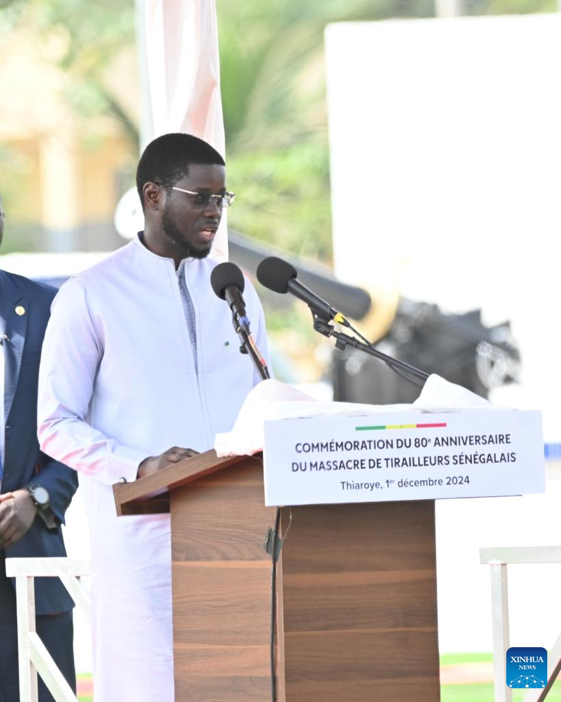 Senegalese President Bassirou Diomaye Faye speaks during a ceremony marking the 80th anniversary of the Thiaroye Massacre held in Thiaroye, Senegal, Dec. 1, 2024. (Photo by Dieylani Seydi/Xinhua)