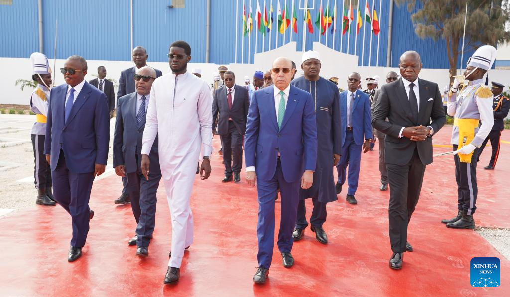 Guinea-Bissau President Umaro Sissoco Embalo (1st L, front), Comorian President Azali Assoumani (2nd L, front), Senegalese President Bassirou Diomaye Faye (3rd L, front), Mauritanian President Mohamed Ould Cheikh Ghazouani (3rd R, front), Gambian President Adama Barrow (2nd R, front) and Gabonese President Brice Clotaire Oligui Nguema (1st R, front) attend a ceremony marking the 80th anniversary of the Thiaroye Massacre held in Thiaroye, Senegal, Dec. 1, 2024. (Photo by Dieylani Seydi/Xinhua)