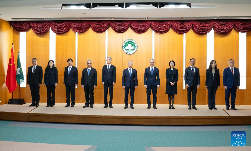 Sam Hou Fai (C), the sixth-term chief executive of the Macao Special Administrative Region (SAR), meets the press at the government headquarters together with the principal officials of the sixth-term government of the Macao SAR and the prosecutor general of the Public Prosecutions Office, in south China's Macao, Dec. 1, 2024. (Photo by Cheong Kam Ka/Xinhua)