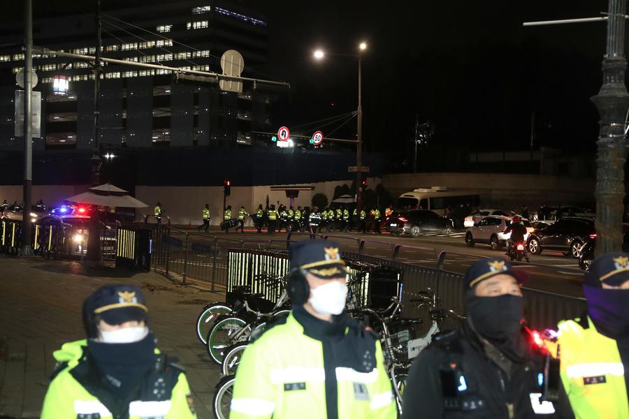 Police officers are seen on duty outside the presidential office in Seoul, South Korea, Dec. 4, 2024. (Xinhua/Yao Qilin)