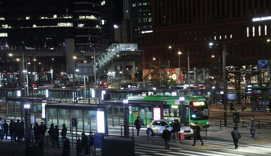 People wait in line at a public transportation stop outside a railway station in Seoul, South Korea, Dec. 3, 2024. (Xinhua/Yao Qilin)