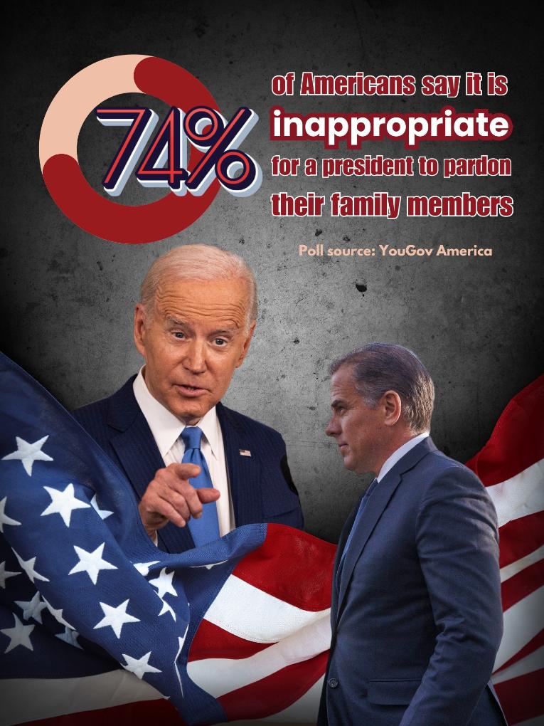 About three quarters of U.S. adult citizens deem it "inappropriate" for a president to pardon their family members, according to a YouGov poll.