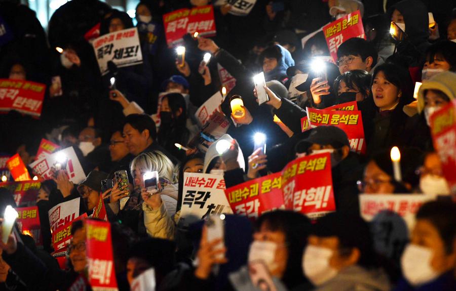On Wednesday night, demonstrators in downtown Seoul held a candlelight vigil and marched towards the presidential office against Yoon, demanding that he step down.■