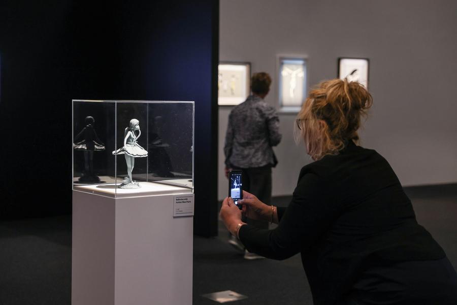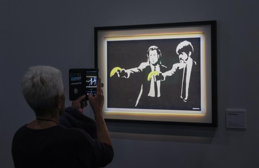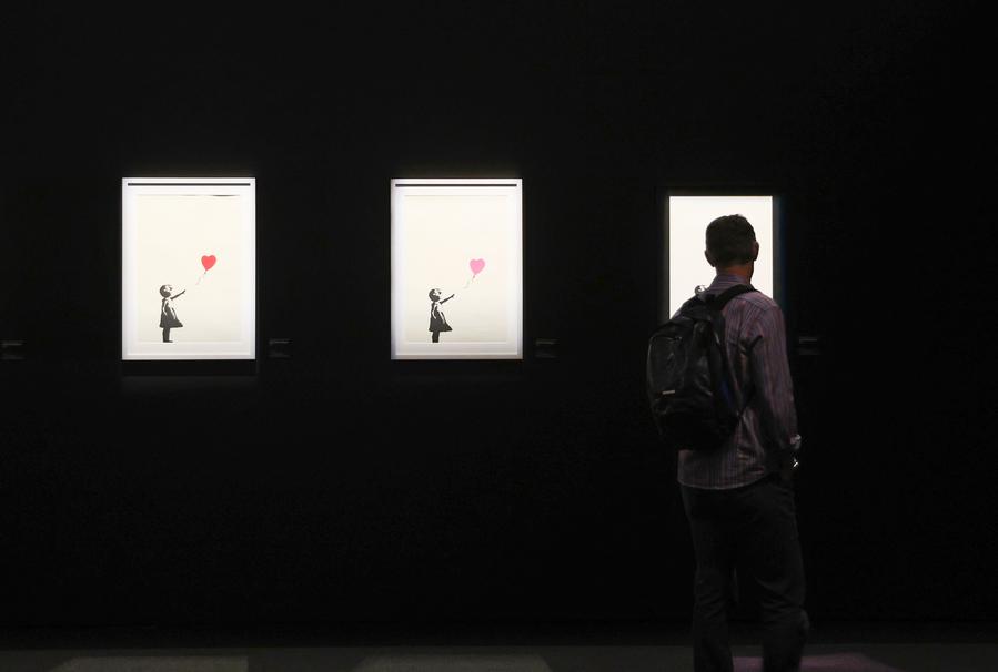 A spectator visits the exhibition "The Art of Banksy" in Wellington, New Zealand, Dec. 3, 2024. (Xinhua/Long Lei)