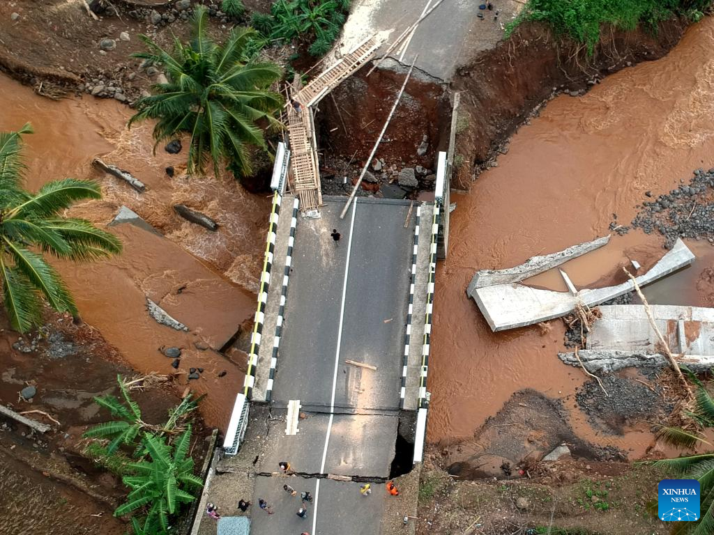 An aerial drone photo taken on Dec. 7, 2024 shows a bridge damaged in flood at Cisarakan village in Sukabumi Regency, West Java Province, Indonesia. Five bodies have been recovered, and seven others are missing after flash floods and landslides destroyed hundreds of houses and infrastructure in Indonesia's West Java province, an official said on Friday. (Photo by Rangga Firmansyah/Xinhua)