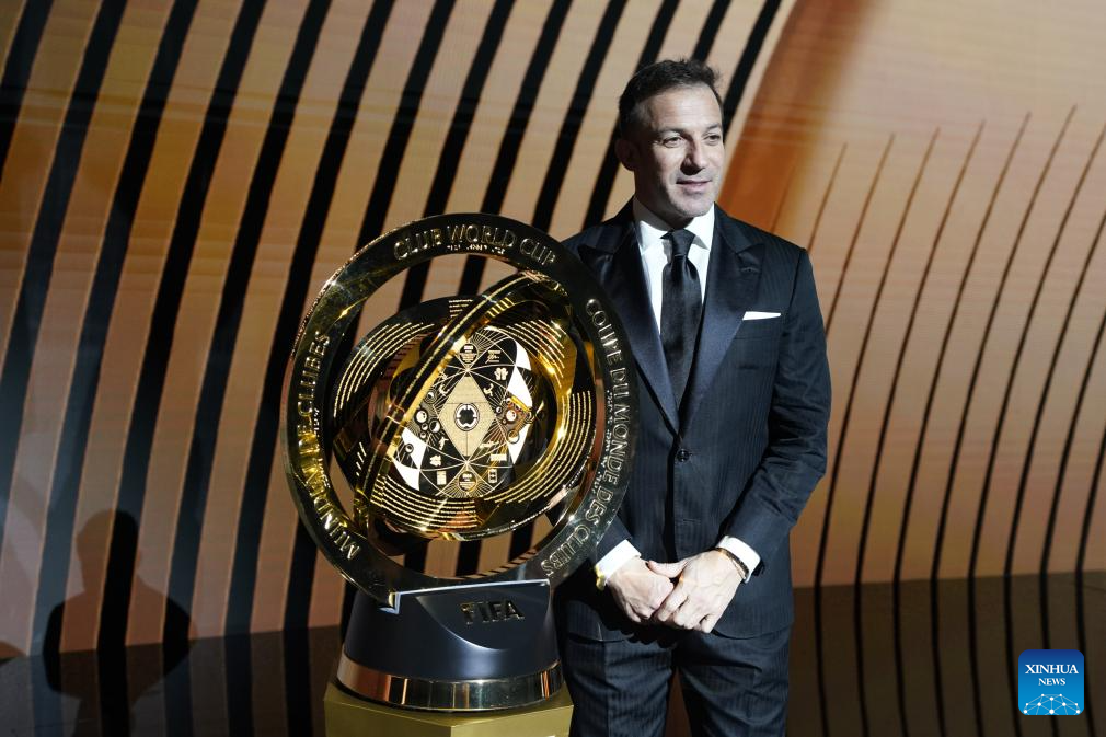 Former Italian football player Alessandro del Piero poses with the trophy of the FIFA Club World Cup 2025 during the draw ceremony for the FIFA Club World Cup 2025 in Miami, the United States, on Dec. 5, 2024. (Xinhua/Wu Xiaoling)