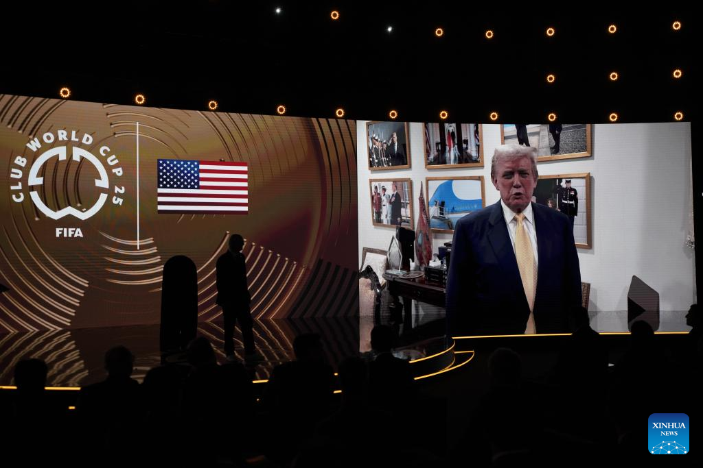 President-elect Donald Trump delivers a speech via video during the draw ceremony for the FIFA Club World Cup 2025 in Miami, the United States, on Dec. 5, 2024. (Xinhua/Wu Xiaoling)
