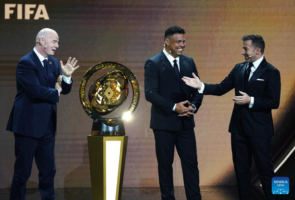 FIFA President Gianni Infantino, former Brazilian football player Ronaldo and former Italian football player Alessandro del Piero (from L to R) attend the draw ceremony for the FIFA Club World Cup 2025 in Miami, the United States, on Dec. 5, 2024. (Xinhua/Wu Xiaoling)