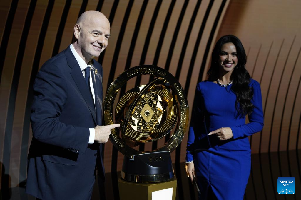 FIFA President Gianni Infantino (L) poses with the trophy of the FIFA Club World Cup 2025 during the draw ceremony for the FIFA Club World Cup 2025 in Miami, the United States, on Dec. 5, 2024. (Xinhua/Wu Xiaoling)