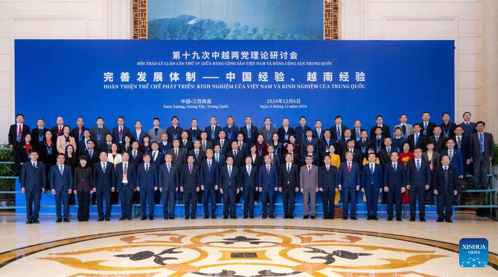 Li Shulei, a member of the Political Bureau of the Communist Party of China (CPC) Central Committee and head of the Publicity Department of the CPC Central Committee, and Nguyen Xuan Thang, a member of the Politburo of the Communist Party of Vietnam (CPV) Central Committee, chairman of the Central Theoretical Council, and president of the Ho Chi Minh National Academy of Politics, pose for a group photo with guests attending the 19th theory seminar held by the CPC and the CPV in Nanchang, east China's Jiangxi Province, Dec. 6, 2024. The CPC and the CPV held their 19th theory seminar here on Friday.