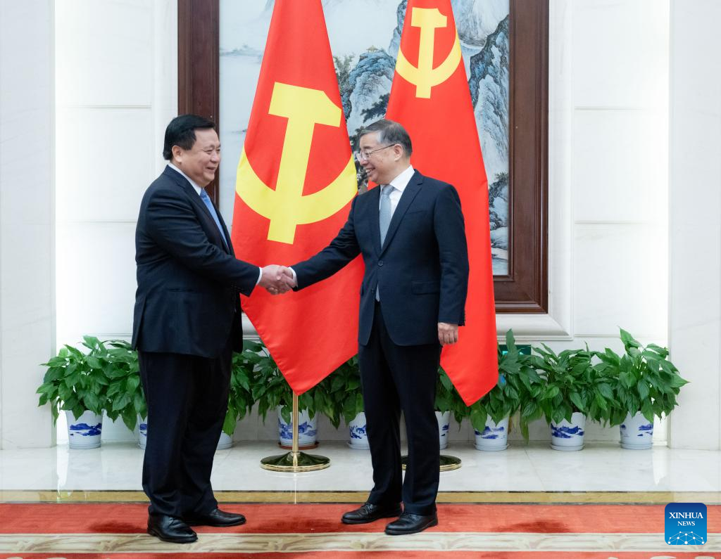Li Shulei, a member of the Political Bureau of the Communist Party of China (CPC) Central Committee and head of the Publicity Department of the CPC Central Committee, meets with Nguyen Xuan Thang, a member of the Politburo of the Communist Party of Vietnam (CPV) Central Committee, chairman of the Central Theoretical Council, and president of the Ho Chi Minh National Academy of Politics, in Nanchang, east China's Jiangxi Province, Dec. 6, 2024. The CPC and the CPV held their 19th theory seminar here on Friday.