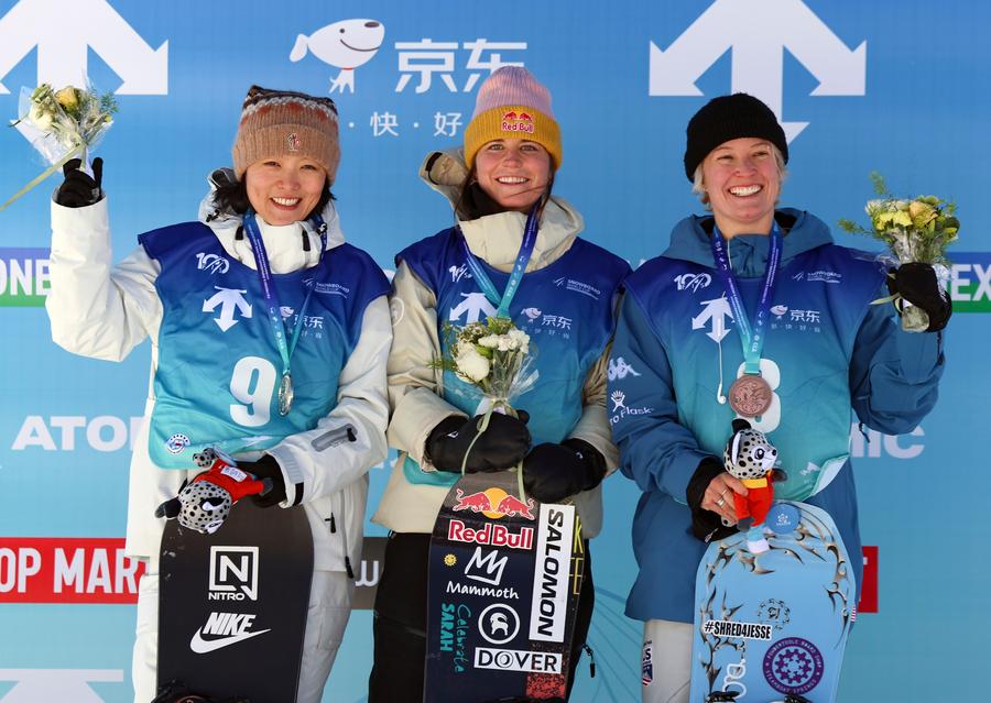 Mastro scored 88.75 points from her second run, clinching her first World Cup title. Three-time world champion Cai fell in her first run, but came back strong in her second attempt and captured the last chance to throw a series of brilliant tricks in her third run to finish second with 86.25 points. The bronze medal went to another U.S. snowboarder Madeline Schaffrick, who notched 85.25 points from her first run.