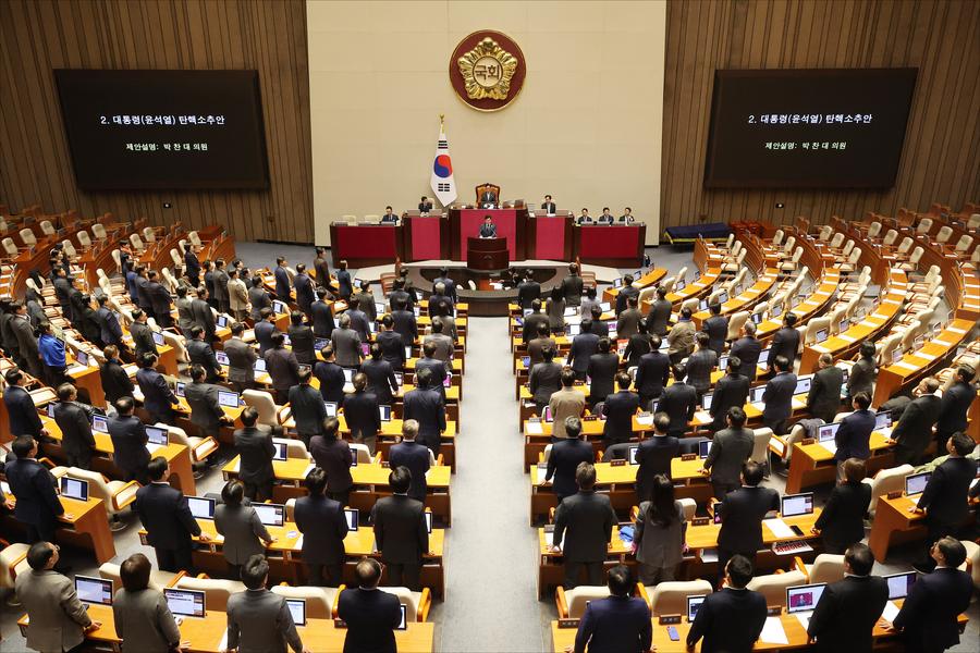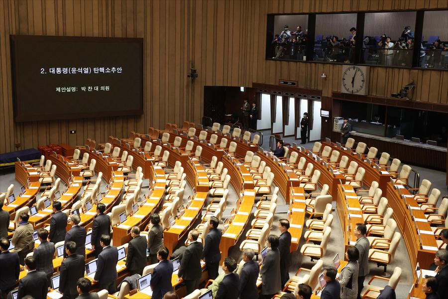 The parliament held a plenary session as scheduled at 5:00 p.m. local time. After voting against a bill to investigate scandals involving Yoon's wife, most of the 108 ruling party lawmakers left the parliament hall. One ruling party lawmaker remained at the hall and two came back after leaving.