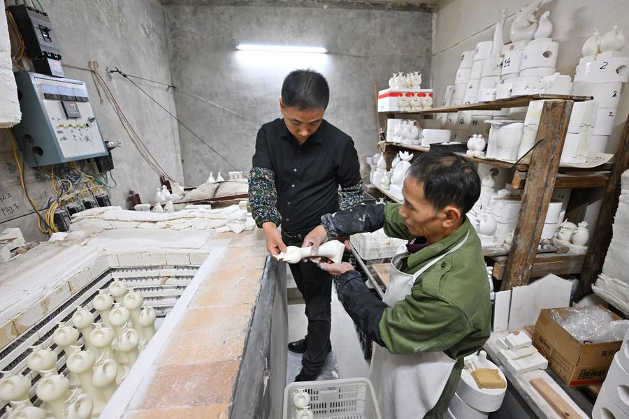 This combo photo taken on Dec. 6, 2024 shows porcelain works displayed at Peng Chengxiong's studio in Dehua County of Quanzhou City, southeast China's Fujian Province. (Xinhua/Zhang Liyun)Peng Chengxiong creates a porcelain work at his studio in Dehua County of Quanzhou City, southeast China's Fujian Province, Dec. 6, 2024. (Xinhua/Jiang Kehong)Peng Chengxiong and his father check on the ceramic body of a porcelain work at Peng's studio in Dehua County of Quanzhou City, southeast China's Fujian Province, Dec. 6, 2024. (Xinhua/Jiang Kehong)Peng Chengxiong and his father check on the ceramic body of a porcelain work at Peng's studio in Dehua County of Quanzhou City, southeast China's Fujian Province, Dec. 6, 2024. (Xinhua/Dai Tianfang)Peng Chengxiong and his wife Zheng Baozhu (L) create porcelain works at Peng's studio in Dehua County of Quanzhou City, southeast China's Fujian Province, Dec. 6, 2024. (Xinhua/Zhang Liyun)Peng Chengxiong and his wife Zheng Baozhu (R) exchange ideas on porcelain designs at Peng's studio in Dehua County of Quanzhou City, southeast China's Fujian Province, Dec. 6, 2024. (Xinhua/Dai Tianfang)Peng Chengxiong makes a porcelain work at his studio in Dehua County of Quanzhou City, southeast China's Fujian Province, Dec. 6, 2024. (Xinhua/Zhang Liyun)Peng Chengxiong creates a porcelain work at his studio in Dehua County of Quanzhou City, southeast China's Fujian Province, Dec. 6, 2024. (Xinhua/Jiang Kehong)Peng Chengxiong and his father take finished porcelain works out of the firing furnace at Peng's studio in Dehua County of Quanzhou City, southeast China's Fujian Province, Dec. 6, 2024. (Xinhua/Jiang Kehong)Peng Chengxiong makes a porcelain design at his studio in Dehua County of Quanzhou City, southeast China's Fujian Province, Dec. 6, 2024. (Xinhua/Zhang Liyun)■