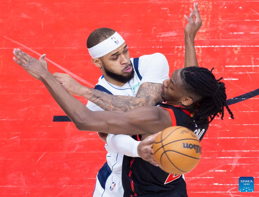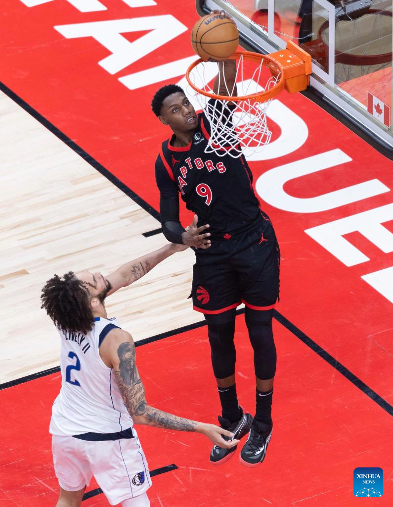 RJ Barrett (R) of Toronto Raptors dunks during the 2024-2025 NBA regular season game between Toronto Raptors and Dallas Mavericks in Toronto, Canada, Dec. 7, 2024. (Photo by Zou Zheng/Xinhua)