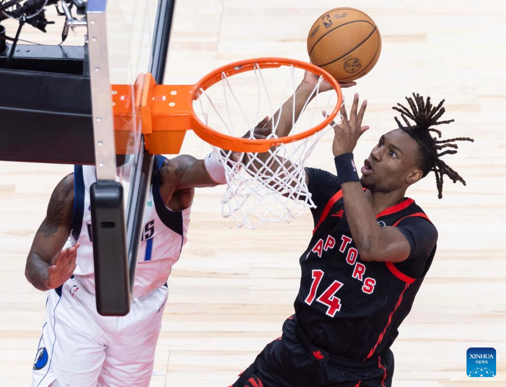 Ja'Kobe Walter (R) of Toronto Raptors goes for a lay-up during the 2024-2025 NBA regular season game between Toronto Raptors and Dallas Mavericks in Toronto, Canada, Dec. 7, 2024. (Photo by Zou Zheng/Xinhua)