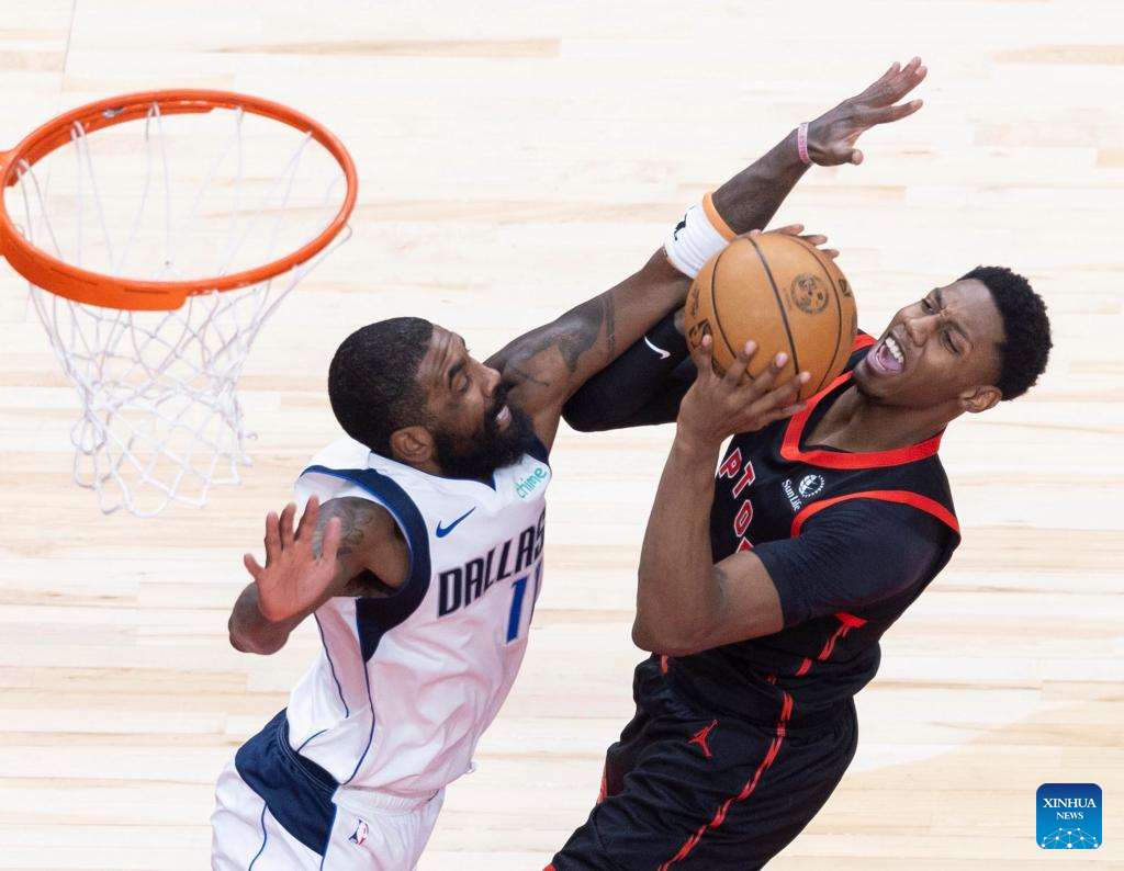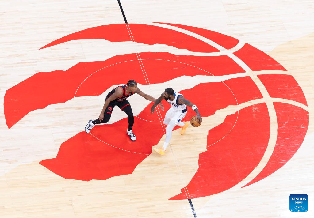 Ochai Agbaji (L) of Toronto Raptors defends Kyrie Irving of Dallas Mavericks during the 2024-2025 NBA regular season game between Toronto Raptors and Dallas Mavericks in Toronto, Canada, Dec. 7, 2024. (Photo by Zou Zheng/Xinhua)