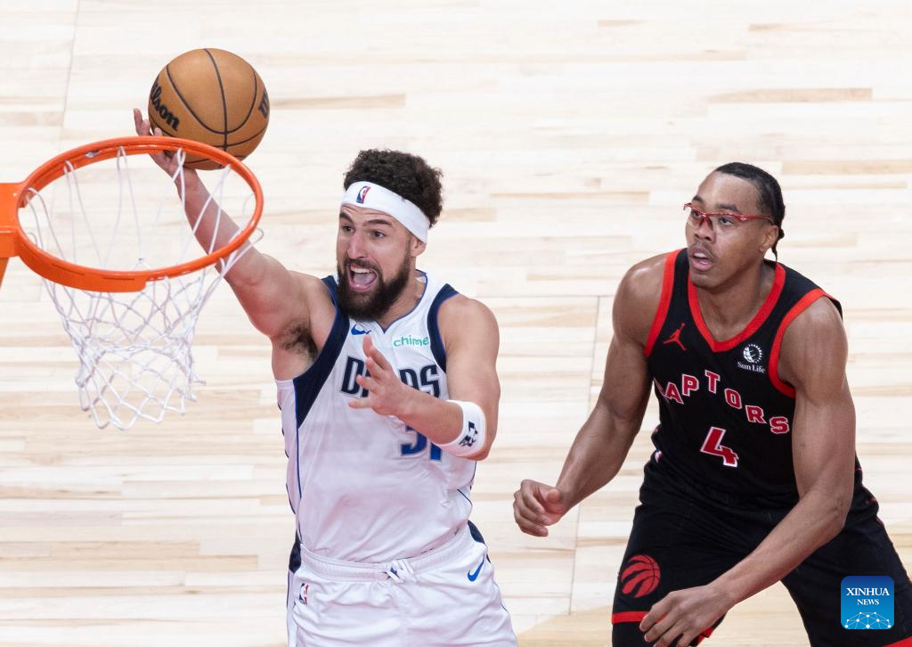 Klay Thompson (L) of Dallas Mavericks goes for a lay-up during the 2024-2025 NBA regular season game between Toronto Raptors and Dallas Mavericks in Toronto, Canada, Dec. 7, 2024. (Photo by Zou Zheng/Xinhua)