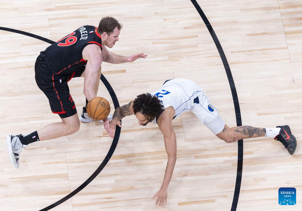 Dereck Lively II (R) of Dallas Mavericks vies with Jakob Poeltl of Toronto Raptors during the 2024-2025 NBA regular season game between Toronto Raptors and Dallas Mavericks in Toronto, Canada, Dec. 7, 2024. (Photo by Zou Zheng/Xinhua)