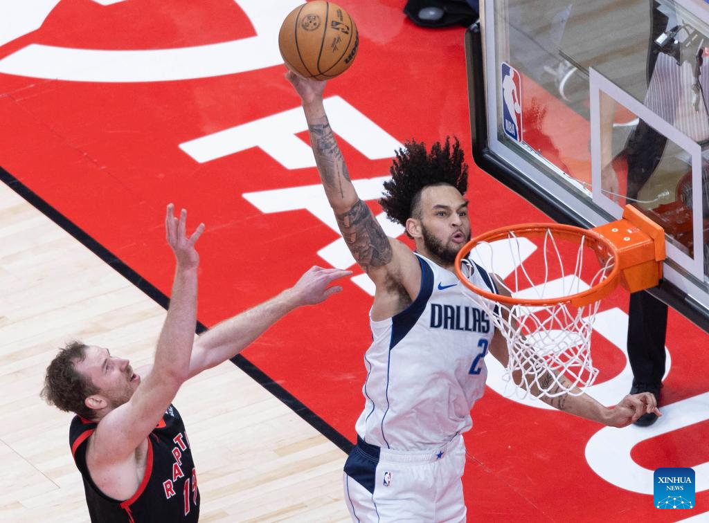 Dereck Lively II (R) of Dallas Mavericks dunks during the 2024-2025 NBA regular season game between Toronto Raptors and Dallas Mavericks in Toronto, Canada, Dec. 7, 2024. (Photo by Zou Zheng/Xinhua)