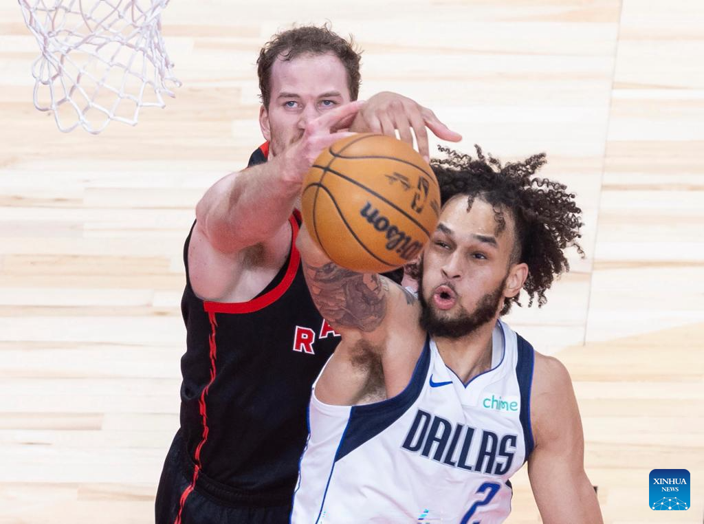 Daniel Gafford (L) of Dallas Mavericks passes the ball during the 2024-2025 NBA regular season game between Toronto Raptors and Dallas Mavericks in Toronto, Canada, Dec. 7, 2024. (Photo by Zou Zheng/Xinhua)