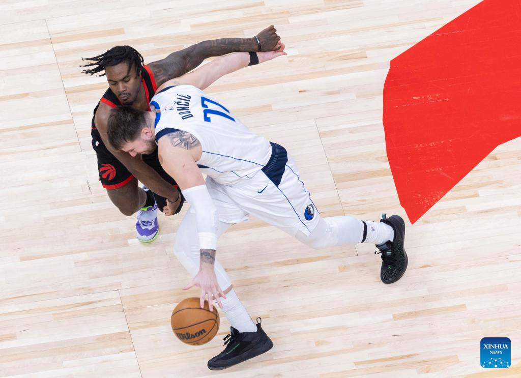 Luka Doncic (bottom) of Dallas Mavericks breaks through during the 2024-2025 NBA regular season game between Toronto Raptors and Dallas Mavericks in Toronto, Canada, Dec. 7, 2024. (Photo by Zou Zheng/Xinhua)