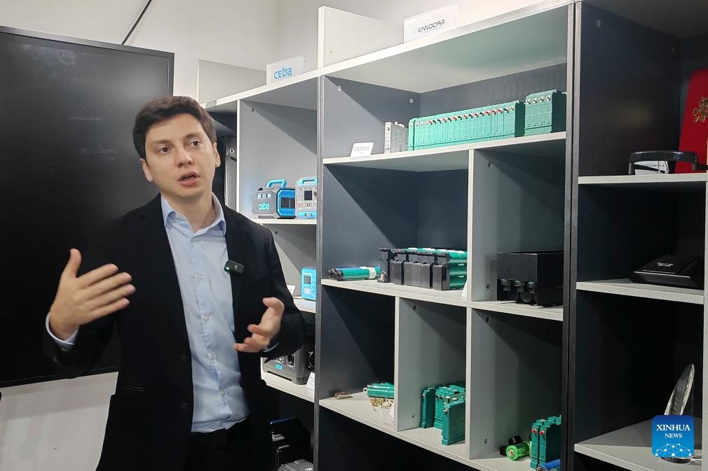 Mehmet Nemo Turker, a young man from the Republic of Türkiye, introduces products to reporters in Shenzhen, south China's Guangdong Province, Nov. 1, 2024. (Xinhua/Bai Yu)