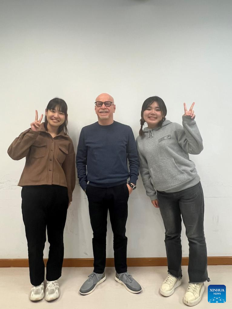 Timothy Simpson (C) poses for a photo after class with two students in south China's Macao, Nov. 29, 2024. (Xinhua)