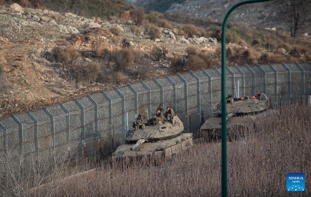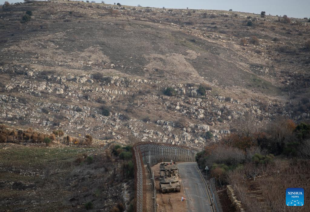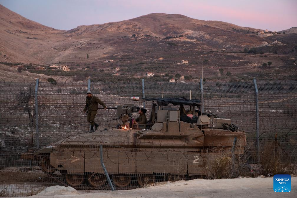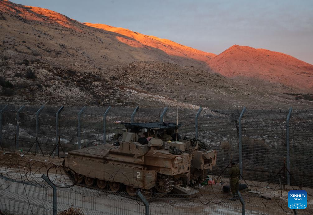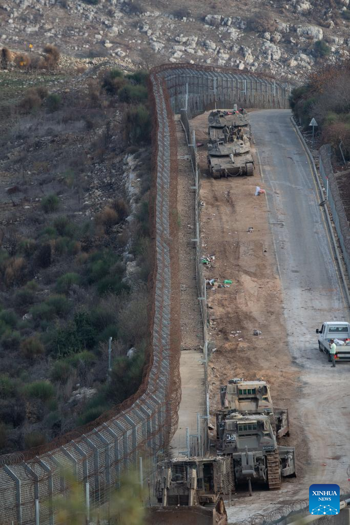 Israeli troops are seen near the buffer zone fence on the eastern side of the Golan Heights, on Dec. 10, 2024. (Xinhua/Chen Junqing)
