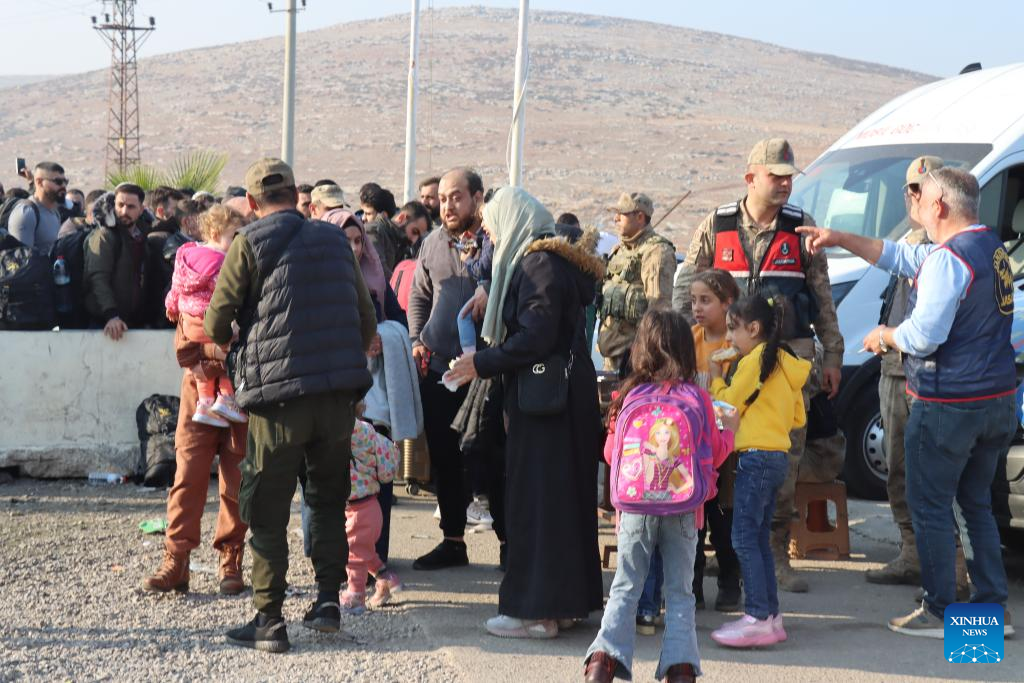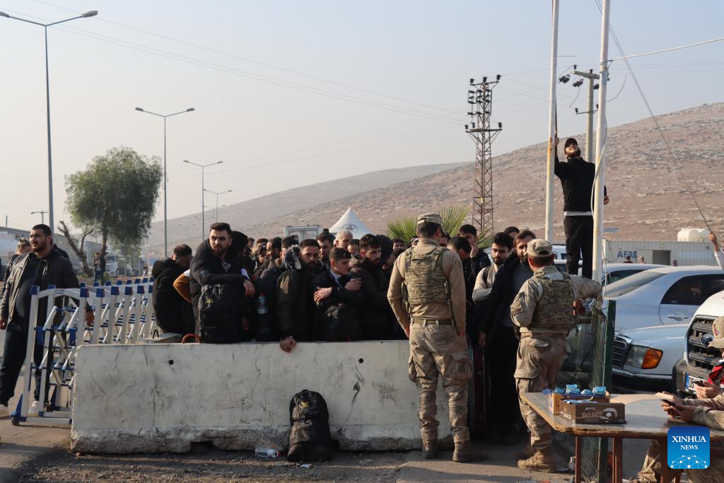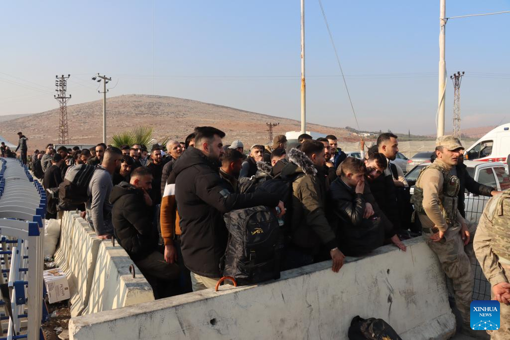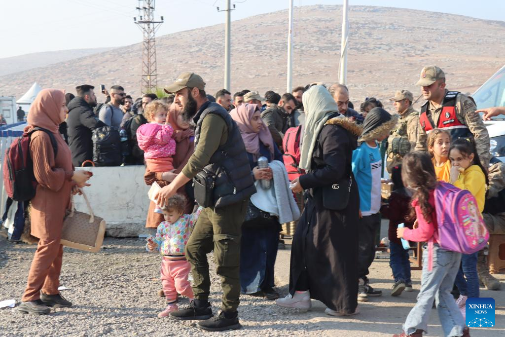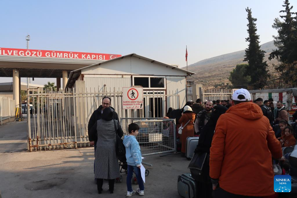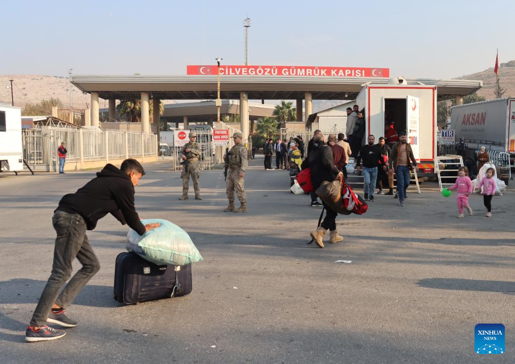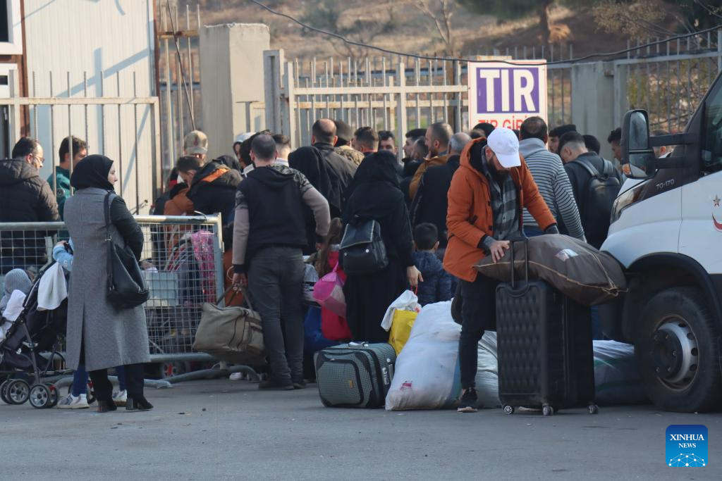 Syrian people prepare to enter Syria from Türkiye at the Cilvegozu Border Gate in Reyhanli district of Hatay, Türkiye, on Dec. 10, 2024. Since early Monday, refugees have been lining up at the Cilvegozu Border Gate in Reyhanli district, completing customs procedures to return. Turkish Interior Minister Ali Yerlikaya said a registered appointment system for exit procedures is being implemented. (Mustafa Kaya/Handout via Xinhua)