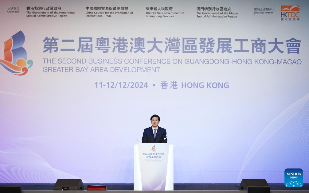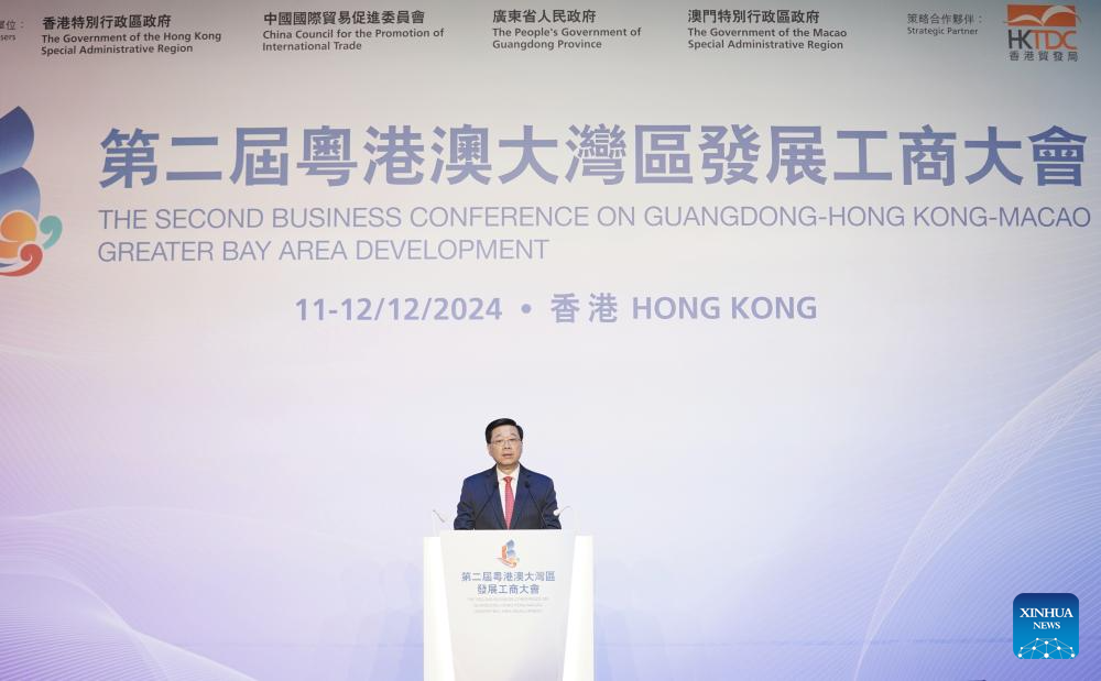 John Lee, chief executive of the Hong Kong Special Administrative Region (HKSAR), addresses the opening ceremony of the Second Business Conference on Guangdong-Hong Kong-Macao Greater Bay Area Development in Hong Kong, south China, Dec. 11, 2024. (Xinhua/Wang Shen)