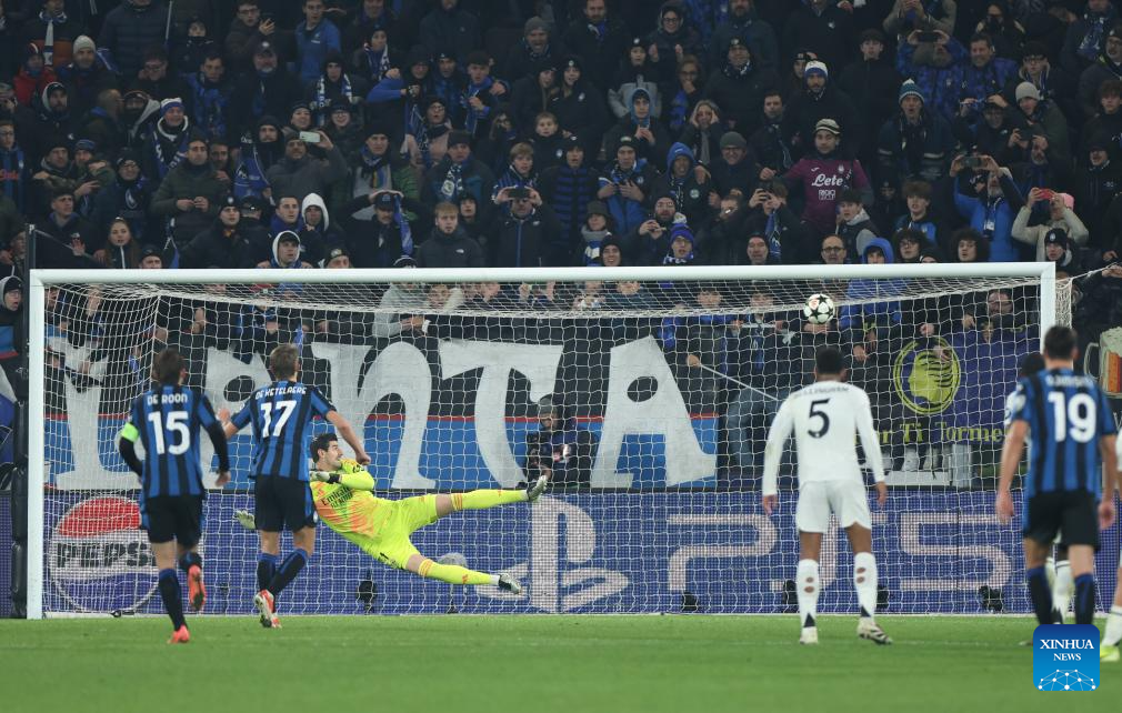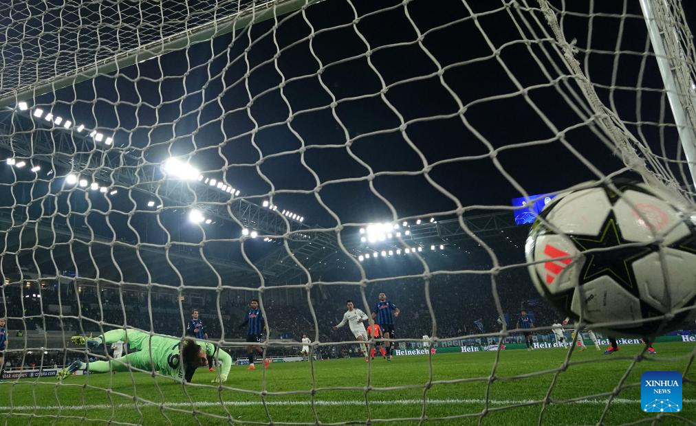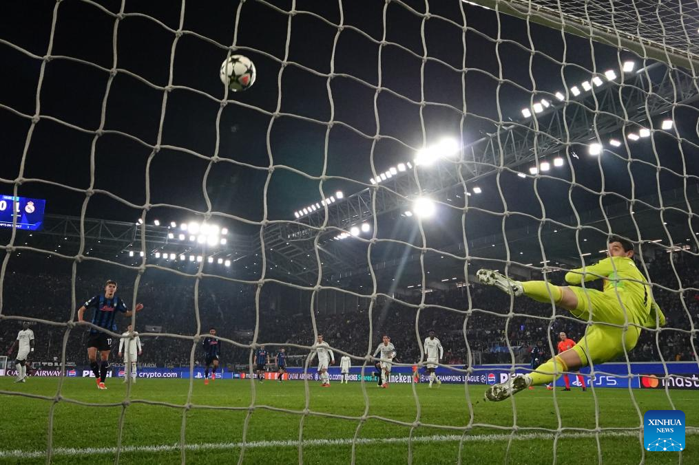 Atalanta's Charles De Ketelaere (2nd R) scores a penalty goal during the UEFA Champions League match between Atalanta and Real Madrid in Bergamo, Italy, Dec. 10, 2024. (Xinhua/Li Jing)