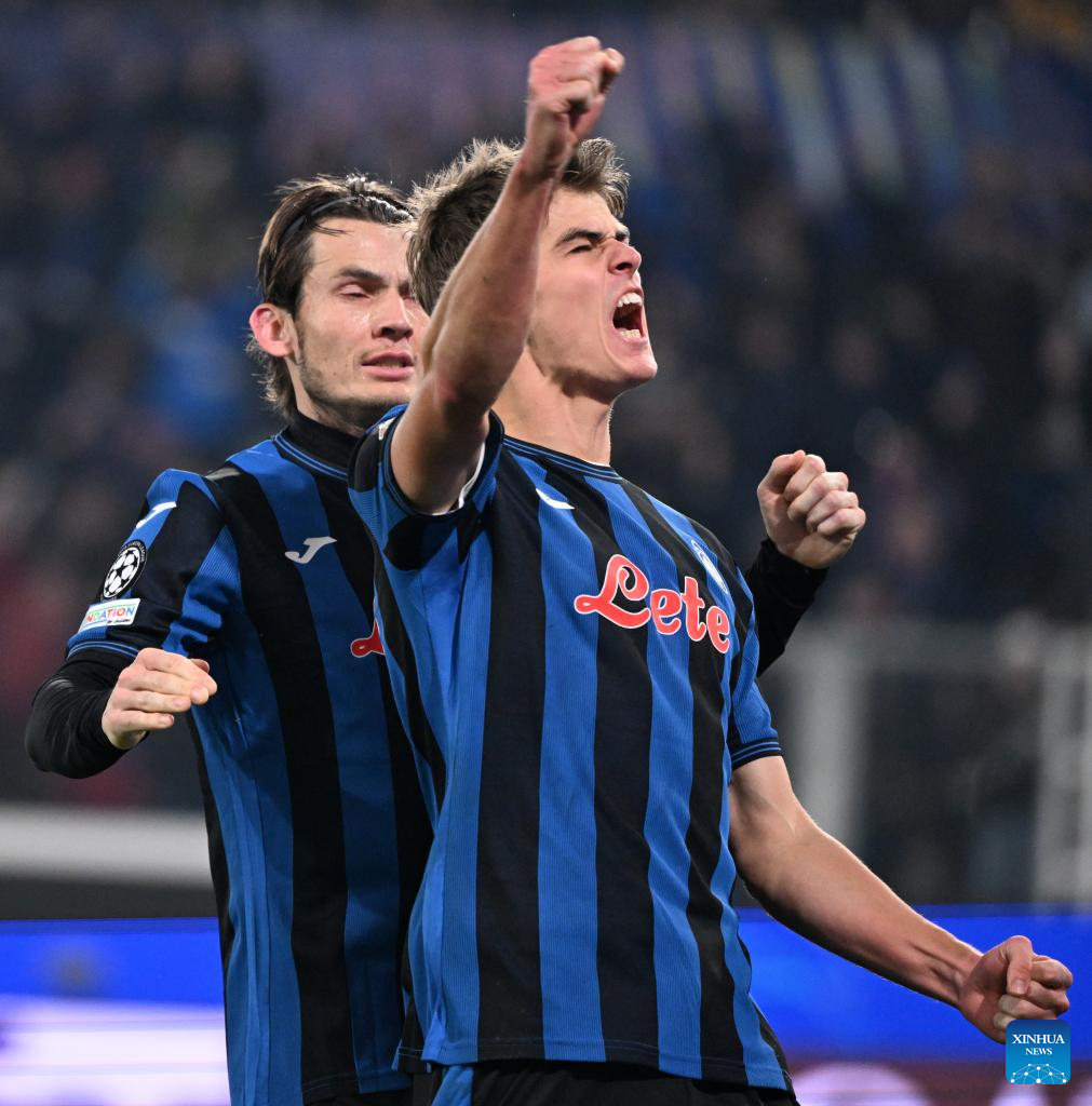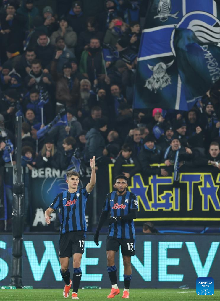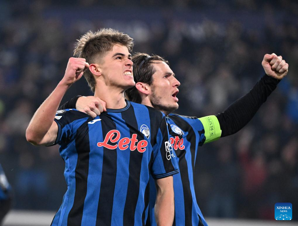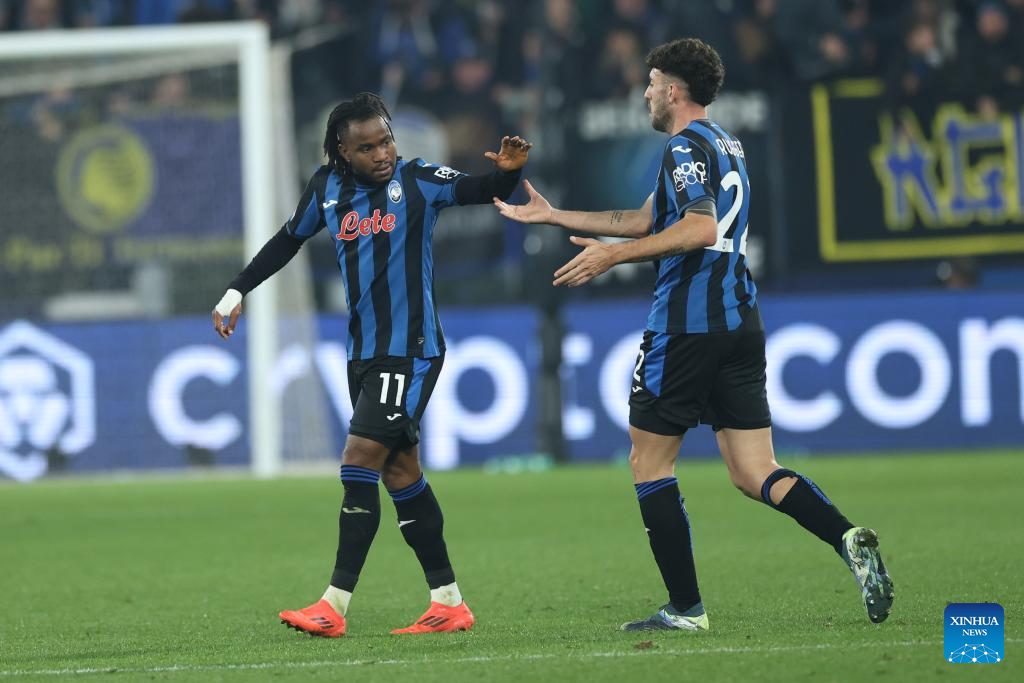 Atalanta's Charles De Ketelaere (L) celebrates his goal during the UEFA Champions League match between Atalanta and Real Madrid in Bergamo, Italy, Dec. 10, 2024. (Xinhua/Li Jing)