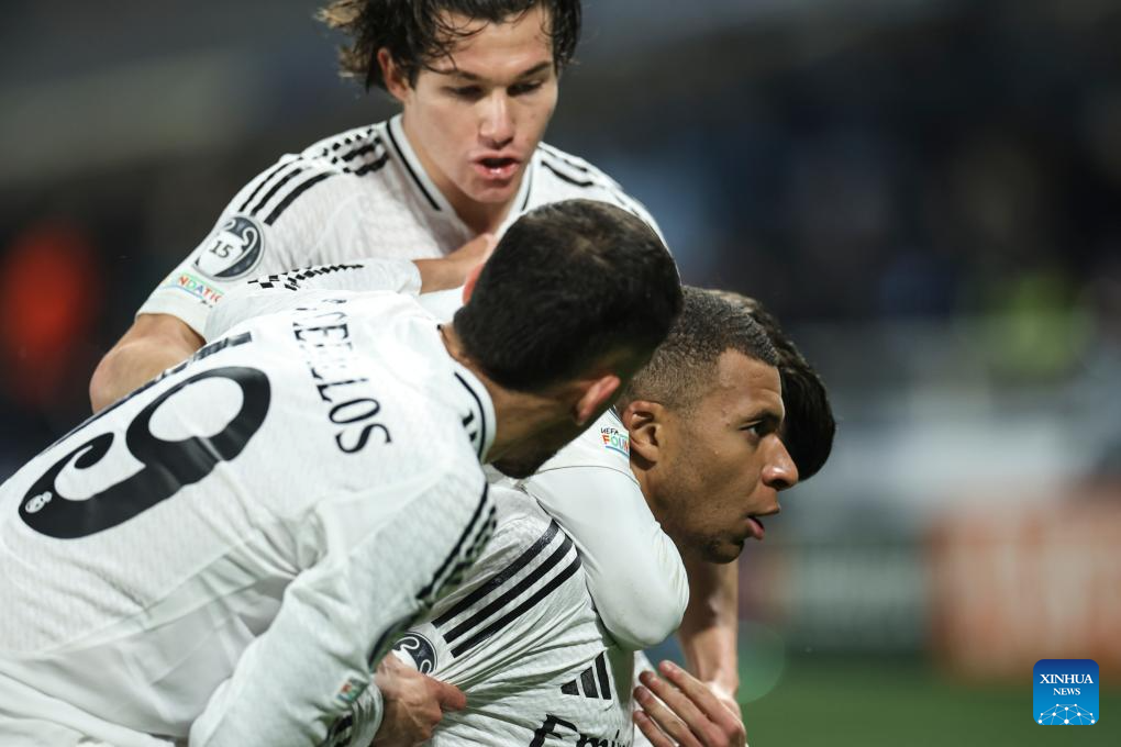 Real Madrid's Kylian Mbappe (R) celebrates his goal with teammates during the UEFA Champions League match between Atalanta and Real Madrid in Bergamo, Italy, Dec. 10, 2024. (Xinhua/Li Jing)