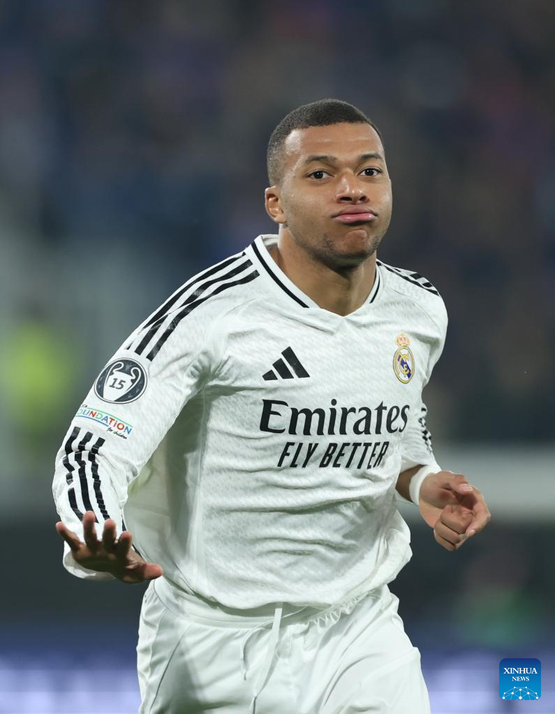 Real Madrid's Kylian Mbappe celebrates his goal during the UEFA Champions League match between Atalanta and Real Madrid in Bergamo, Italy, Dec. 10, 2024. (Xinhua/Li Jing)